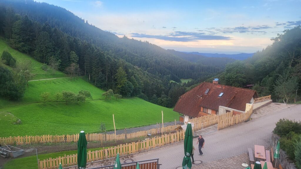 Jetzt zum Frühstück und dann zur Zuflucht (so heißt die Gasstätte dort und auch wohl der Ort selbst), wo unsere heutige Etappe startet, die wieder am Harkhof enden wird. Die Fahrt zur Zuflucht dauert ziemlich lange, bergauf, bergab und viele Kurven. Der Harkhof liegt auch ziemlich ab vom Schuss.