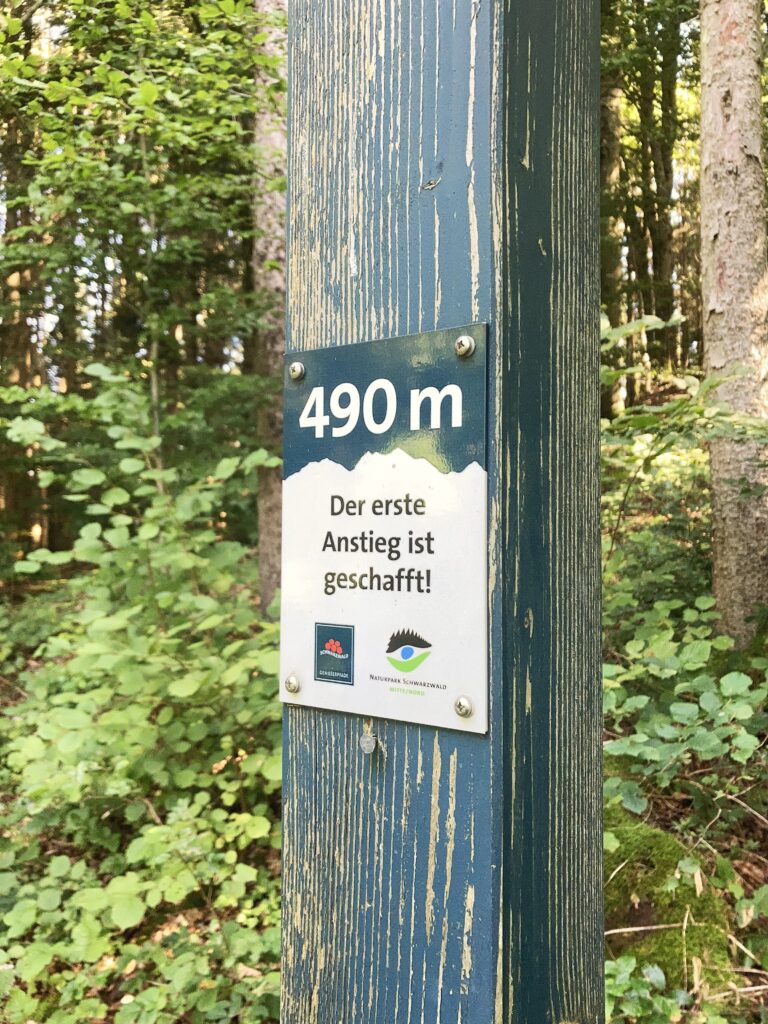 Wir stellen unser Auto am Bahnhof in Hausach ab und gehen durch das Städtchen ein Stück an der Kinzig entlang. Am Ortsende biegen wir nach links in den Wald ab. Hier erwartet uns gleich der erste Anstieg, vor dem sogar in Andreas E1-Buch „gewarnt“ wird.