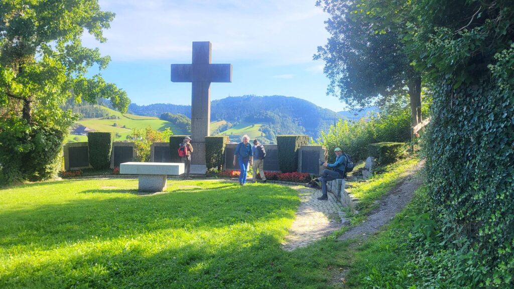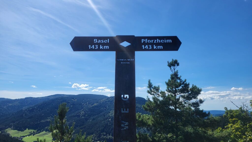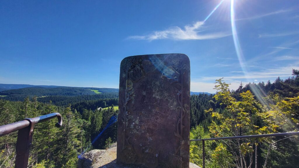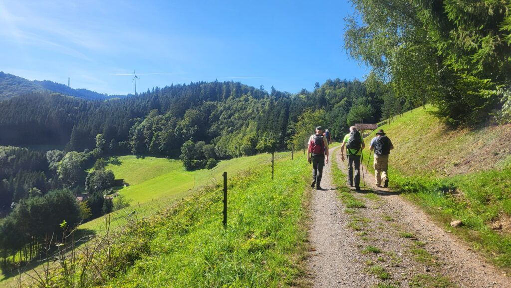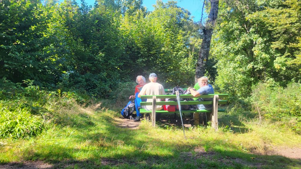 Oben angekommen finden wir Bänke, eine Hütte und treffen auf eine Wandergruppe des Schwarzwaldvereins. In netter Gesellschaft schmecken die mitgebrachten Brote doppelt gut und wie so häufig löst die Geschichte unserer nunmehr fünfundzwanzigsten Wanderung etwas Bewunderung aus.