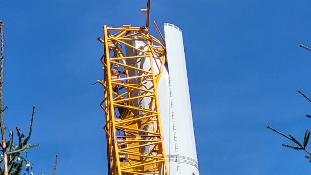 Wir passieren mehrere Windräder und Windradbaustellen, eine davon mit eher mäßigem Erfolg.