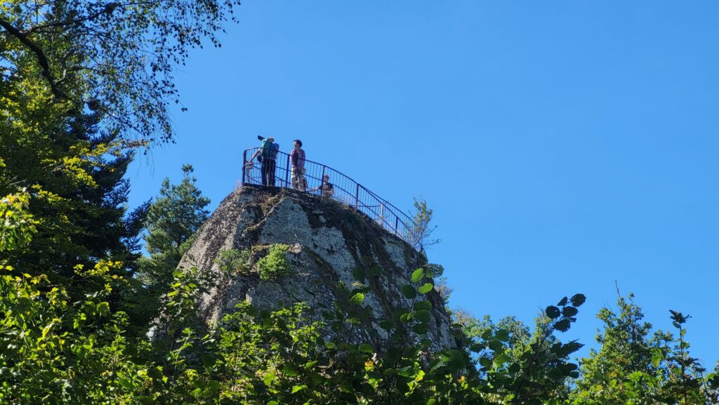Auf der Hälfte des Aufstiegs und der Hälfte des Westwegs liegt der Huberfelsen und wir genießen das Panorama von oben und eine kurze Pause.